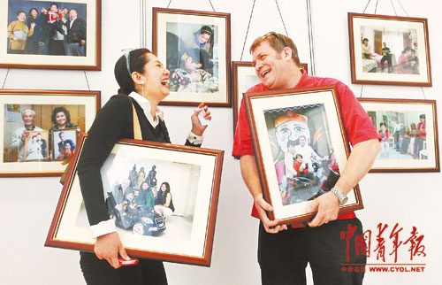 5月14日,“5·15”國際家庭日前夕,來自美國的白云龍(右)正抱著自家的合影照片與同在北京市朝陽區(qū)三里屯地區(qū)生活的李雨靜愉快地交談,他們兩家都是中西合璧的家庭。當天,三里屯街道舉辦了“美麗三里屯 幸福一家人”圖片展,100戶家庭都會收到其樂融融的家庭合影照片。本報記者 趙青攝