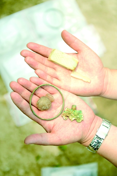 5月21日,考古人員在天津武清區(qū)古代墓葬考古發(fā)掘現(xiàn)場(chǎng)展示出土的文物。新華社發(fā)(王曉明攝)