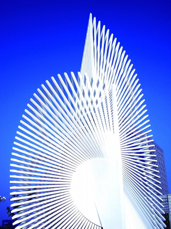 城雕的靈魂是與環(huán)境及空間的有機結(jié)合,王培波駕馭多種形式元素,為城市空間構(gòu)建出異彩紛呈的視覺焦點。他的作品結(jié)合了兩種張力與造型:一種是內(nèi)斂式的,風格外緣圓弧,并作多層次的韻律重復,以增強語言力度,作品內(nèi)部多透間隙,呈現(xiàn)出豐富的光影效果;另一種是發(fā)散式的,充分考量線條聚合的輻射力度及空間張力。在青島、重慶、營口,沈陽等城市中,王培波的雕塑藝術(shù),已經(jīng)成為一道獨特的景觀而深受歡迎。