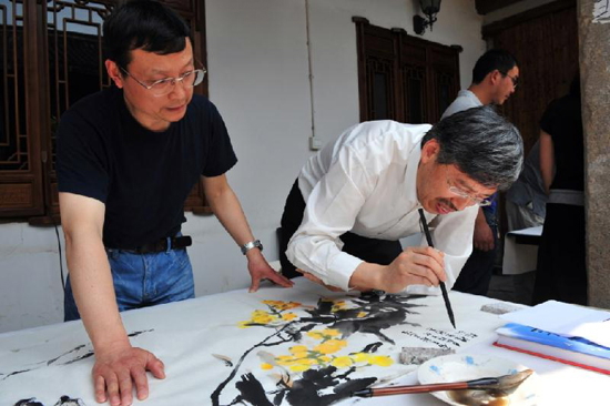 在葉店村文化禮堂,來自浙江畫院的孫永等8位書畫名家與金華市文聯的書畫家們一起對葉店村書畫愛好者進行了輔導。從構圖到筆法,從水法到墨法,都進行了詳細講解和示范。書畫家們揮毫潑墨,現場創作了10多幅書畫作品。