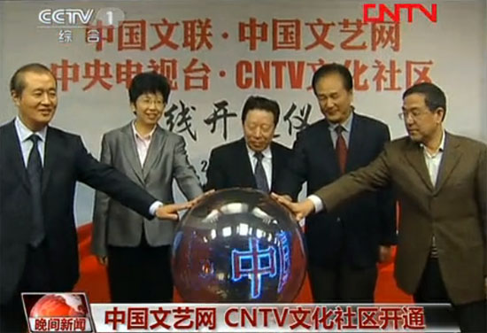孫家正和蔡名照、趙實(shí)、李偉、焦利共同點(diǎn)擊開(kāi)通中國(guó)文藝網(wǎng)和CNTV文化社區(qū)。