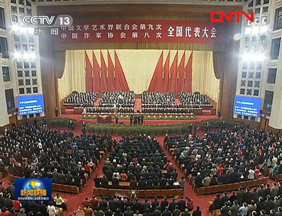 中國網(wǎng)絡(luò)電視臺(tái)(新聞聯(lián)播):偉大的時(shí)代呼喚偉大的作家、藝術(shù)家,偉大的人民期盼偉大的文藝作品。中國文學(xué)藝術(shù)界聯(lián)合會(huì)第九次全國代表大會(huì)、中國作家協(xié)會(huì)第八次全國代表大會(huì)今天上午在人民大會(huì)堂開幕。中共中央總書記、國家主席、中央軍委主席胡錦濤發(fā)表重要講話。他強(qiáng)調(diào),廣大文藝工作者要認(rèn)清時(shí)代和人民賦予的神圣使命,堅(jiān)持為人民服務(wù)、為社會(huì)主義服務(wù),堅(jiān)持百花齊放、百家爭鳴,堅(jiān)持貼近實(shí)際、貼近生活、貼近群眾,高擎民族精神火炬,吹響時(shí)代前進(jìn)號(hào)角,創(chuàng)作生產(chǎn)更多無愧于歷史、無愧于時(shí)代、無愧于人民的優(yōu)秀作品,奮力開創(chuàng)文藝發(fā)展新局面,為推動(dòng)社會(huì)主義文化大發(fā)展大繁榮、建設(shè)社會(huì)主義文化強(qiáng)國貢獻(xiàn)智慧和力量。