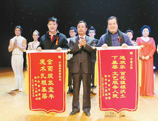 演出期間,寶豐縣委書記劉書鋒代表寶豐縣委縣政府向邊發吉、邵學敏贈送了錦旗,對中國文聯、中國雜協“送歡樂、下基層”活動表示感謝。邵學敏表示,寶豐縣是中國魔術之鄉、曲藝之鄉,也是革命老區,為這里的群眾帶來歡樂具有特殊的意義。此次活動組織了很多在國內外獲得過金獎的節目,為的就是讓老百姓享受到豐盛的文藝大餐。