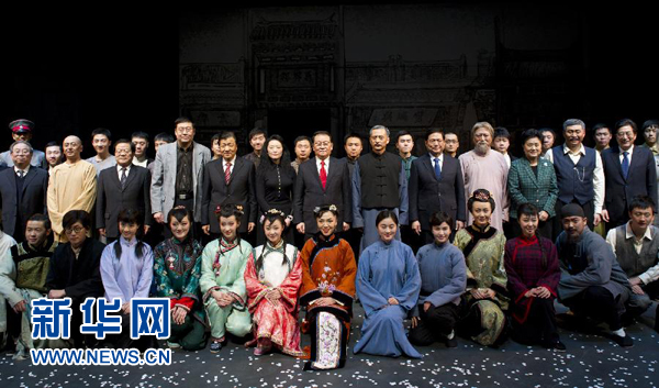 12月23日,中共中央政治局常委李長春在北京國家大劇院觀看國家大劇院推出的原創話劇《王府井》。這是演出結束后,李長春與演職人員合影。新華社記者黃敬文攝