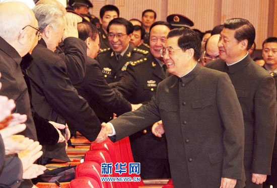 1月12日,中央軍委慰問駐京部隊老干部迎新春文藝演出在北京舉行。中共中央總書記、國家主席、中央軍委主席胡錦濤出席觀看,向在座的軍隊老同志和全軍離退休老干部致以新春問候,祝福大家新春快樂、健康長壽。中共中央政治局常委、國家副主席、中央軍委副主席習近平出席。新華社記者 王建民 攝