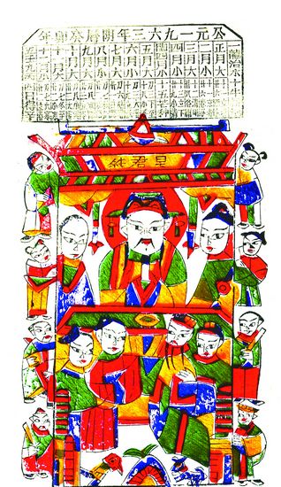 “灶王”又名“灶神”、“灶君”,是中國神話傳說中司飲食之神。傳說“灶王”于農(nóng)歷臘月二十四日至除夕上天陳報人間善惡,所以民間有在十二月廿三日(小年)晚祭祀“灶王”的習俗,除夕夜晚再行接“灶王”之禮。關于“灶王”的來歷說法不一,其中北方流行“灶王”是玉帝女婿的傳說。傳說玉帝有個小女兒私下凡間,與一位小伙子結(jié)為夫妻,并為其夫君燒火煮飯。玉帝知道后,非常生氣,就將夫妻倆封為“灶王爺”與“灶王奶奶”。后來,灶王奶奶看到百姓生活困苦,就經(jīng)常借上天庭的機會偷偷帶些吃的東西分給百姓,玉帝知道后,下旨只準女兒、女婿每年臘月二十三回天宮一趟。此后,民間就有了每年臘月二十三進行一次大掃除,晚上祭灶,送灶王爺、灶王奶奶回天宮,到了正月初一五更,再將他倆接回人間的民俗。