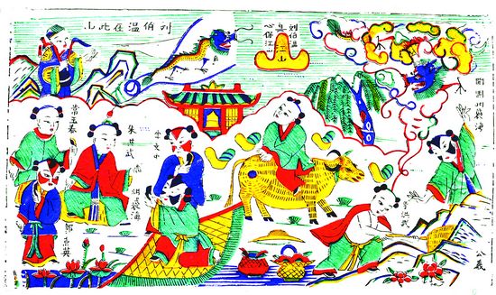 本次展覽的第二部分“戲出·傳說”中,展出了許多以中國戲曲文化和廣泛流傳于民間的歷史傳說、典故為素材的年畫。其中一張來自楊家埠的“民子山”年畫,據(jù)說與山東楊家埠年畫起源有著密切的關系。