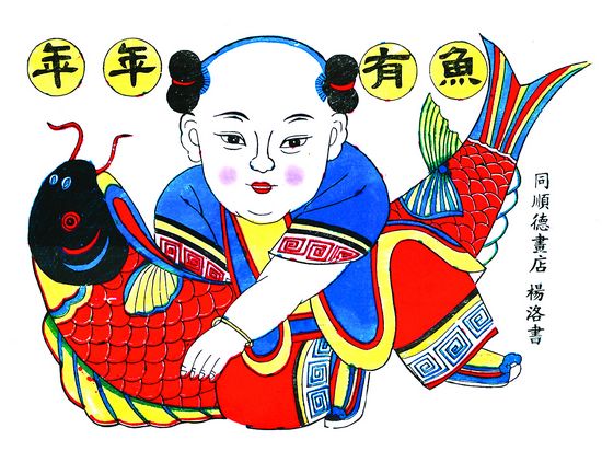 中國百姓每逢年節(jié)喜事,講究良多,尤其注重講吉利話,這在民間被稱為“討口彩”。在這類“討口彩”的年畫中,最有代表性的是“年年有余(魚)”年畫。在中國傳統(tǒng)文化中,“魚”和“余”諧音,所以魚象征著富貴、富裕。在我國廣為流傳的年畫和吉祥圖中,經(jīng)常有魚出現(xiàn)。年畫和吉祥圖中的魚大部分是鯉魚或金魚,因為“鯉”和“利”諧音,金則表示財富,所以它們就常和生意聯(lián)系在一起,用來象征在生意中受益和賺錢。