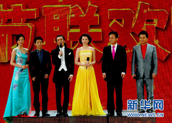 1月22日晚,中央電視臺將舉行2012年春節聯歡晚會。主題為“回家過大年”的央視龍年春晚將突出“年”的元素和“聯歡”“互動”,晚會由39個節目組成,時長260分鐘。這是彩排時拍攝的央視春晚主持人李思思、撒貝寧、李詠、董卿、朱軍、畢福劍(從左至右)。 新華社發