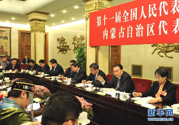 3月7日,中共中央政治局常委李長春參加十一屆全國人大五次會議內蒙古代表團的審議。 新華社記者 饒愛民 攝