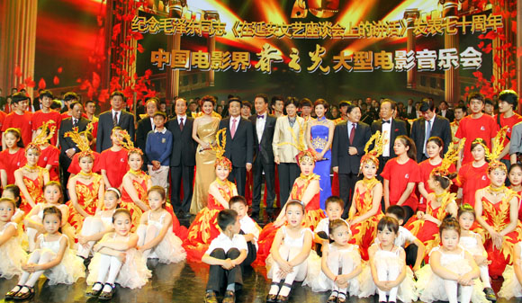 5月15日晚,中國電影界“春之光”大型電影音樂會在京上演。圖為相關領導與演員合影