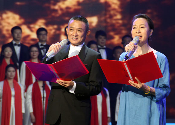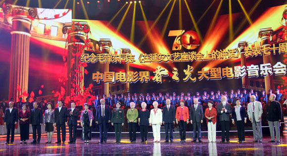 “我們的電影,曾經歷世紀的征程,在銀幕上描繪出不朽的華彩;我們的電影,今天仍青春勃發、熠熠生輝,是靠怎樣的薪火傳承,開啟我們繼往開來的心扉?”在奚美娟和徐濤深沉而動情的詩歌朗誦聲中,由韓中、劉勁、王伍福等著名特型演員扮演的毛澤東、劉少奇、周恩來、朱德和任弼時登上舞臺,“毛主席”緩緩道出了《在延安文藝座談會上的講話》中那段永放光輝的名言:“我們的文學藝術都是為人民大眾的,首先是為工農兵的,為工農兵而創作,為工農兵所利用的。”
