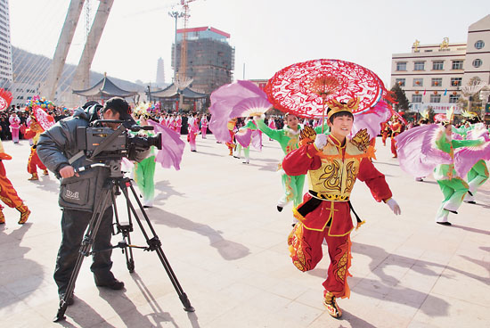 紀(jì)錄片《大魯藝》攝制現(xiàn)場(chǎng):攝像孫培強(qiáng)在陜北拍攝秧歌