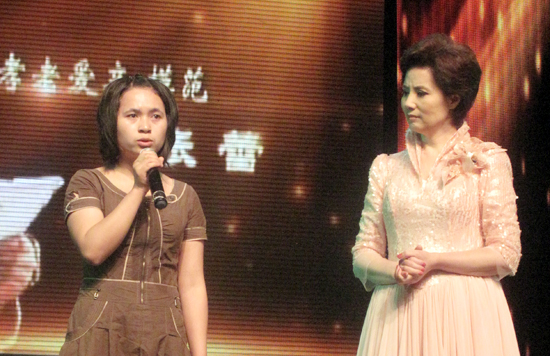 5月22日,“全國(guó)道德模范故事匯”基層巡演2012福建福州專場(chǎng)中,第三屆全國(guó)孝老愛(ài)親道德模范張蕾接受主持人采訪。劉紅英 攝