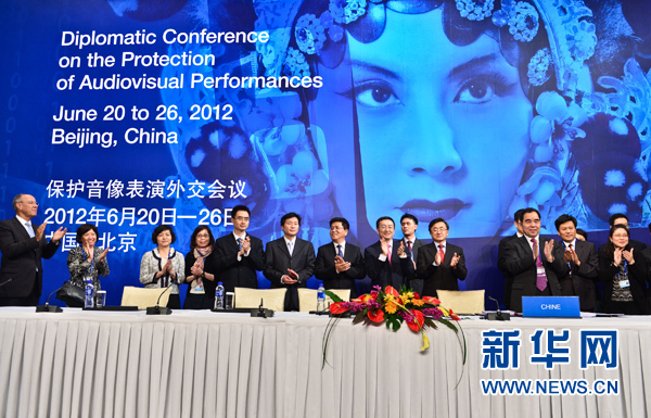6月26日,《視聽表演北京條約》在京締結。“北京條約”的誕生,標志著談判了近20年的視聽表演者版權保護的國際新條約終于修成正果。隨著“北京條約”的締結,由世界知識產權組織舉辦,中國國家版權局、北京市人民政府承辦的保護音像表演外交會議落下帷幕。本次會議是世界知識產權組織近16年來在版權領域召開的首個外交大會,也是新中國成立以來首次承辦涉及版權條約締結的外交會議。150多個國家、40多個國際組織的700多名代表齊聚北京,共商音像表演保護大計。新華社記者 李文 攝