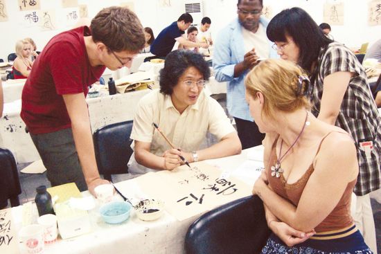 書法是中國最具民族特色的藝術形式之一。全球化時代,世界需要多樣化的文化,這一觀念已成為全球共識。隨著中國改革開放,國際交流日益頻繁。歷史悠久的中國書法藝術,越來越吸引世界各國愛好東方文化的朋友的關注。來華考察、學習中國文化、中國藝術的人士,也越來越多。如何跨越語言、文化、文字可能帶來的障礙,向來自世界各國不同文化背景的學生介紹中國書法,這是時代給我們書法藝術工作者提出的新課題。近年來,中國人民大學藝術學院在這一領域做了一些嘗試和探索。