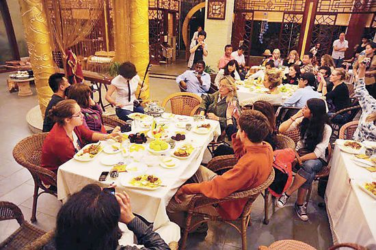 平涼市文聯、平涼崇古齋,為這次活動在住宿交通飲食各方面,做了精心安排,他們邀請了本地能講英文的學生全程陪同。圖為當地學生在晚餐后表演才藝。中外學生聯歡氣氛融洽。