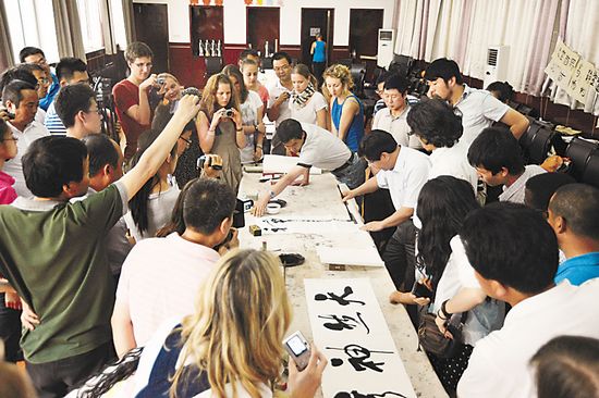 7月2日,中國人民大學“暑期國際小學期 (International Summer School)”書法班開學。這是自2010年以來,人大藝術學院第三次面向海外招收國際學生。本期學員23人,來自法國、意大利、加拿大、愛爾蘭等12個國家和地區。這些學生除一兩個同學主修東亞文化,曾有漢語學習經歷外,多數同學是第一次來中國,第一次接觸中國毛筆。