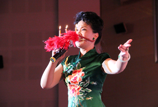 演出中既讓觀眾感到新奇又欽佩不已的當屬含燈大鼓表演藝術家溫淑萍的表演了。她在嘴里含著一根筷子,筷子上擺放著三支正在燃燒的蠟燭的情況下,依舊將《青藏高原》這首高難度歌曲演繹得非常到位。當天舞臺上的風有點大,所以蠟燭燒得很快,盡管火焰的溫度烤得臉非常難受,可是為了打消觀眾心中這可能不是真唱的疑慮,溫淑萍還是堅持清唱了一段,現場觀眾為藝術家此般敬業精神報以熱烈的掌聲和歡呼聲。“我每年都會到基層為觀眾演出10多次,雖然表演這個節目有時會冒著頭發或眉毛被燒到的風險,但是每當看到自己的演出能給觀眾帶來歡笑和愉悅,我覺得這點小風險算不上什么。”溫淑萍一邊揭著手上已經發干的蠟油,一邊跟記者聊著自己參加基層演出的心得。