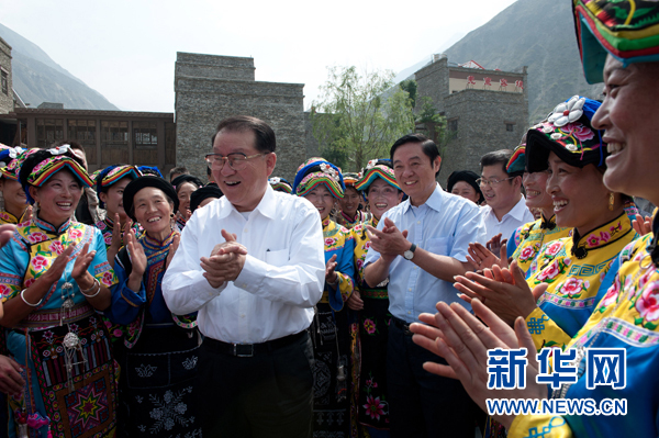 9月5日至9日,中共中央政治局常委李長春先后到阿壩、成都等地,深入村寨、企業、社區和宣傳文化單位,就四川推進災后恢復重建和發展振興、加快轉變經濟發展方式、推動文化繁榮發展等進行調研。這是9月7日,李長春在理縣桃坪羌寨實地察看群眾安置和恢復重建情況。 新華社記者 江宏景 攝