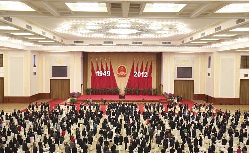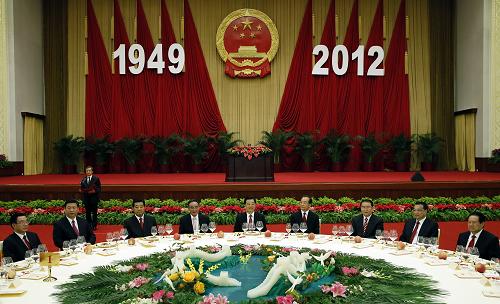 9月29日,國務院在人民大會堂舉行盛大招待會,熱烈慶祝中華人民共和國成立63周年。胡錦濤、吳邦國、溫家寶、賈慶林、李長春、習近平、李克強、賀國強、周永康等黨和國家領導人與中外人士歡聚一堂,共慶佳節。新華社記者鞠鵬 攝