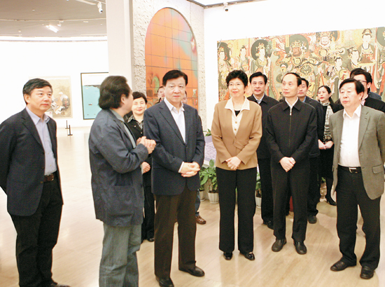 中國文聯(lián)黨組書記、副主席趙實(shí),中宣部副部長翟衛(wèi)華,北京市委常委、宣傳部部長、副市長魯煒,中國文聯(lián)黨組成員、副主席楊承志,文化部黨組成員董偉,中國文聯(lián)黨組成員、書記處書記李前光,中國文聯(lián)副主席、中國美協(xié)主席劉大為,中國美協(xié)分黨組書記、駐會(huì)副主席吳長江等陪同參觀。