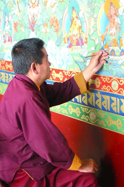 ③西藏昌珠寺的喇嘛正在修復(fù)壁畫。