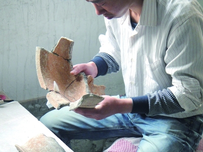 技術(shù)人員正在拼對良渚遺址出土的陶片。
