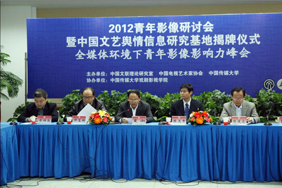 10月25日,由中國(guó)文聯(lián)理論研究室、中國(guó)視協(xié)、中國(guó)傳媒大學(xué)聯(lián)合主辦的“2012青年影像研討會(huì)暨中國(guó)文藝輿情信息研究基地揭牌儀式”在京舉行,中國(guó)文聯(lián)黨組成員、書(shū)記處書(shū)記夏潮,中國(guó)傳媒大學(xué)黨委書(shū)記陳文申,以及仲呈祥、陳建文、張顯、廖祥忠等中國(guó)文聯(lián)、中國(guó)視協(xié)、中國(guó)傳媒大學(xué)相關(guān)領(lǐng)導(dǎo)出席活動(dòng)。夏潮、陳文申共同為“中國(guó)文藝輿情信息研究基地”揭牌。夏潮在揭牌儀式上講話。他說(shuō),綜觀當(dāng)前文藝創(chuàng)作現(xiàn)狀,青年文藝工作者正逐步成為文藝事業(yè)繁榮發(fā)展的中堅(jiān)力量。特別是包括電視、電影、攝影在內(nèi)的影像創(chuàng)作,青年文藝工作者已經(jīng)成為創(chuàng)作的主體。隨著現(xiàn)代高新科技特別是數(shù)字技術(shù)、信息技術(shù)、網(wǎng)絡(luò)技術(shù)的迅猛發(fā)展和廣泛應(yīng)用,青年文藝工作者擁有更為活躍的創(chuàng)作思維,更為開(kāi)闊的創(chuàng)作眼界和更為前衛(wèi)的創(chuàng)作理念,在接受、運(yùn)用高新技術(shù)參與影像創(chuàng)作方面有著先天優(yōu)勢(shì)。而對(duì)于影像作品的受眾來(lái)說(shuō),也是以青年人為主要群體。可以說(shuō),青年影像的價(jià)值取向和影響力對(duì)于引領(lǐng)社會(huì)風(fēng)尚、弘揚(yáng)社會(huì)主義核心價(jià)值體系都有著至關(guān)重要的作用。希望通過(guò)舉辦這次研討會(huì),青年文藝工作者相互交流,加強(qiáng)合作,不斷擴(kuò)大青年影像的傳播力、影響力,為引導(dǎo)創(chuàng)作出更多更優(yōu)秀的影像作品起到更好的推動(dòng)作用。