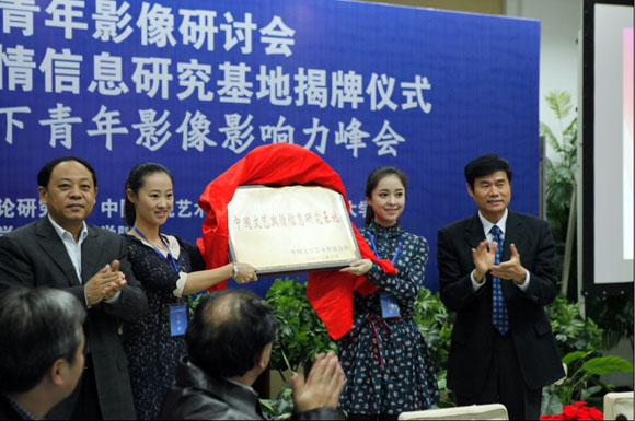 中國(guó)文聯(lián)黨組成員、書(shū)記處書(shū)記夏潮,中國(guó)傳媒大學(xué)黨委書(shū)記陳文申共同為“中國(guó)文藝輿情信息研究基地”揭牌