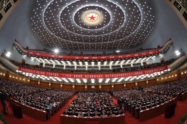 人民大會堂,華燈綻放著繁星般的光芒。主席臺上,金色的黨徽上鐮刀與錘頭熠熠生輝,十面紅色的旗幟鮮艷奪目。高懸的會標牽動著世界的目光:“中國共產黨第十八次全國代表大會。”