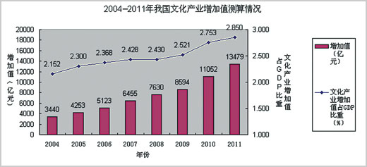 黨的十六大以來,隨著文化體制改革的深入推進,合格文化市場主體數量不斷增多,社會各方面投入文化產業的熱情高漲,各項扶持政策不斷出臺,我國文化產業正進入發展的黃金期,文化產業增加值逐年提升。記者從有關部門獲悉,2011年文化產業法人單位增加值達13479億元,占GDP比重達2.85%;文化產業法人單位增加值占GDP比重從2004年的1.94%增至2011年的2.85%,年平均增長23.35%。