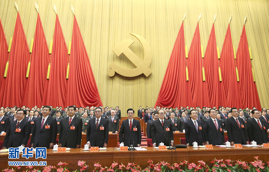 11月14日,中國共產黨第十八次全國代表大會在北京人民大會堂閉幕。這是胡錦濤、江澤民、吳邦國、溫家寶、賈慶林、李長春、習近平、李克強、賀國強、周永康在主席臺上。新華社記者鞠鵬攝