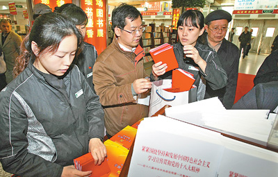 11月21日,工作人員在幫助讀者整理購買黨的十八大文件及學習輔導讀物。當日,由人民出版社出版的黨的十八大文件及學習輔導讀物首發式在北京圖書大廈舉行。李方宇攝(新華社發)