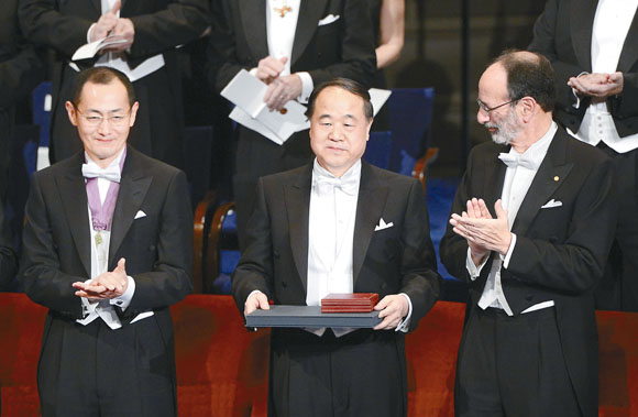 中國作家莫言(中)12月10日在瑞典首都斯德哥爾摩音樂廳獲頒2012年諾貝爾文學獎。