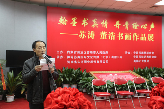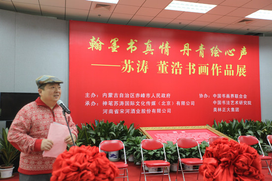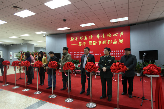 翰墨書盛世華章,丹青繪錦繡畫卷,12月13日,由內(nèi)蒙古自治區(qū)赤峰市人民政府主辦,神筆蘇濤國際文化傳媒(北京)有限公司、河南宋河酒業(yè)股份有限公司承辦,中國書畫界聯(lián)合會、中國書法藝術(shù)研究院,美林正大集團(tuán)協(xié)辦的的“翰墨書真情,丹青繪心聲—蘇濤、董浩書畫作品展”在中國人民革命軍事博物館舉行。中組部辦公廳原主任、中國書協(xié)顧問權(quán)希軍、中央電視臺原副總編輯、中央電視臺書畫院院長趙立凡、中國人民革命軍事博物館副館長向榮高、國家畫院辦公室主任胡寶利內(nèi)蒙古自治區(qū)赤峰市委常委、軍分區(qū)政委句建奇、河南鄭州宋河酒業(yè)股份有限公司總經(jīng)理朱杰以及文藝界知名人士近百人出席了開幕式。