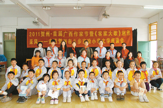 2011年5月,首屆廣西作家節在賀州市舉行,圖為作家們深入校園與小學生交流