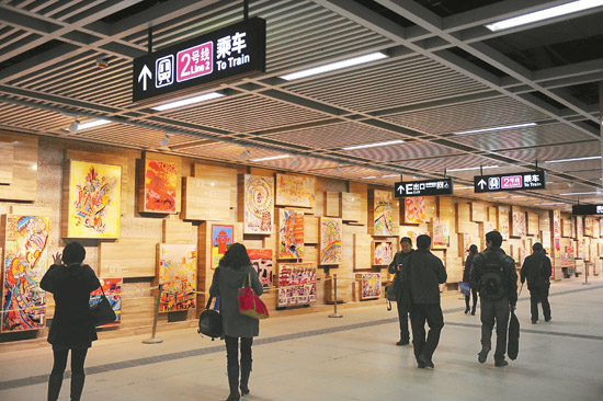近日,中國首條穿越長江的地鐵——武漢地鐵二號線一期工程正式通過專家評審,將于12月28日通車試運營。工程全長27.73公里,在武昌和漢口兩鎮共設車站21座,是武漢市第一條地下軌道交通工程。圖為武漢地鐵洪山廣場站,通道中用武漢各小學的學生畫作進行裝飾(12月14日攝)。