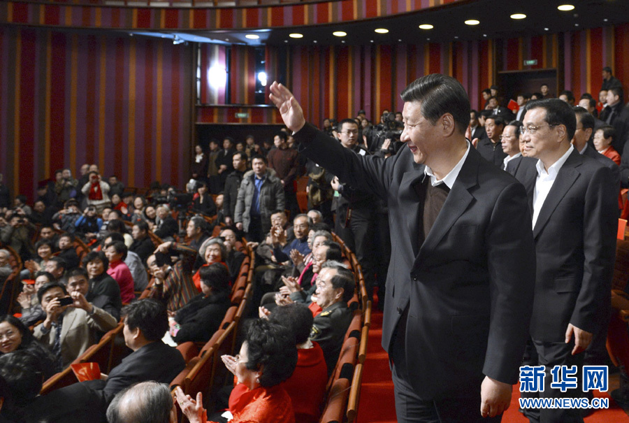 12月30日晚,2013年新年京劇晚會在北京國家大劇院舉行。黨和國家領導人習近平、李克強、張德江、俞正聲、劉云山、王岐山、張高麗,與首都近千名群眾一起觀看演出,喜迎新年的到來。這是習近平向演員和觀眾招手致意。新華社記者 馬占成 攝
