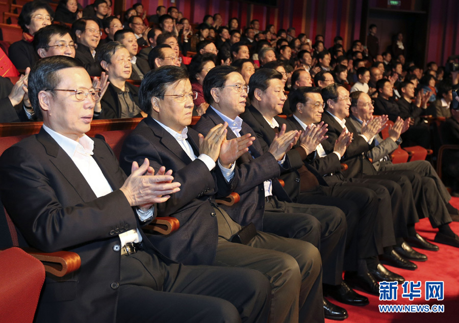 12月30日晚,2013年新年京劇晚會在北京國家大劇院舉行。黨和國家領導人習近平、李克強、張德江、俞正聲、劉云山、王岐山、張高麗,與首都近千名群眾一起觀看演出,喜迎新年的到來。新華社記者 丁林 攝