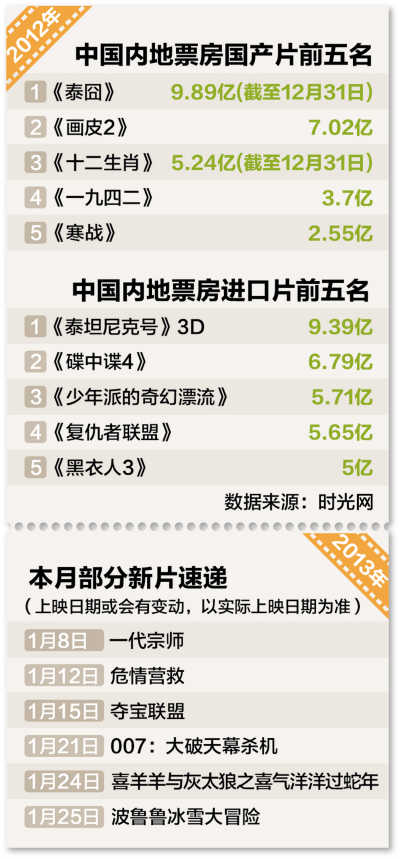 2013年1月,中國電影市場上將至少上映14部影片,其中不乏《一代宗師》、《007:大破天幕殺機》等頗具話題效應的大片,而國產電影最新的票房紀錄也將在本月浮現。