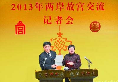 1月22日,臺北故宮博物院院長馮明珠(右)向北京故宮博物院院長單霽翔遞交邀請函,邀請其赴臺北故宮訪問。新華社記者 金良快攝