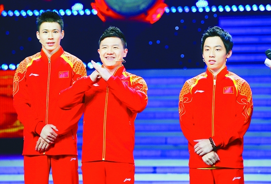 “吉尼斯中國之夜”節(jié)目中體操奧運冠軍陳一冰、鄒凱、張成龍向觀眾拜年