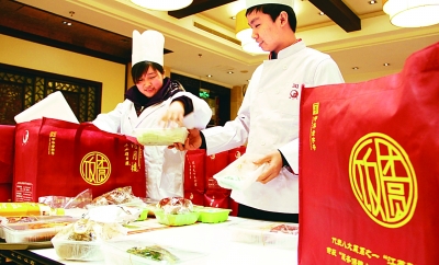 2月7日,蘇州某飯店服務員為“打包年夜飯”配菜。新華社發(fā) 朱桂根攝