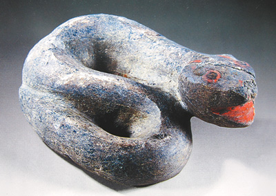 蛇,在中國古代也被視為豐收或子孫繁衍的象征物,特別是在西南或南方地區的古代文化中,常見以蛇為母題的文物。年代最早的是相當于商代晚期古蜀人遺址出土的圓雕石蛇,在四川省成都金沙遺址至少發現過4件,石蛇頭三角形,圓目張口,口唇涂成朱紅色,身軀呈“S”形蟠曲,被認為是用于祭祀或與原始宗教有關的道具。南方地區的青銅器,也常飾有蛇紋,例如廣西恭城出土的春秋時期的青銅尊上就有生動的雙蛇斗蛙連續圖案。稍遲一些生活在西南的古代民族更常以蛇為豐收或大地的象征物,例如云南省晉寧石寨山、江川李家山等地發掘的古代滇人的墓葬中,經常出土以蛇造型的文物。有以蛇頭作銎的青銅鏟,也有以蛇體作柄的青銅劍,柄首是張口的蛇頭,形態極為生動。至于大量出土的以鳥獸人物為題材的青銅扣飾上,更是多飾有糾纏蟠曲的長蛇。一些表現祭祀、祈年等場景的青銅儲貝器蓋上的立體群雕中,也少不了蛇的身影。特別是在一座滇王的墳墓中,出土了西漢中央頒賜的黃金印,印文為“滇王之印”,印上的印紐也鑄成一條蟠曲的金蛇,成為滇王高貴身份和權威的象征。