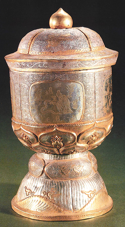 陜西扶風法門寺唐塔地宮出土的金花銀香寶子。