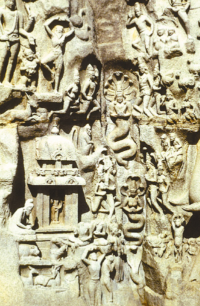 印度的蛇神通稱那伽(蛇),漢譯佛經誤譯為“龍”,那伽也被列為護佛的“天龍八部”之一。在古代印度佛教和印度教雕刻中,那伽的形象通常都是人首蛇身,頭上有5個或7個眼鏡蛇頭兜,狀如光環或華蓋。南印度馬哈巴利普拉姆的巨巖浮雕《恒河降凡》(約公元670年)在代表恒河的瀑布中暢泳的男女蛇神形象,就是典型的一例。