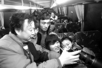 圖為2月1日凌晨,江蘇如皋,返鄉農民工在免費包車上觀看記者拍攝的照片。CFP