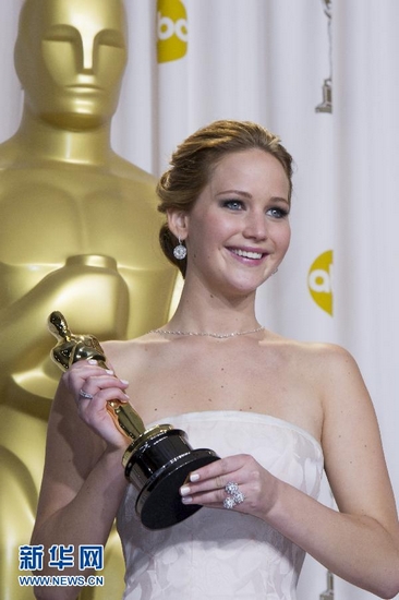 2月24日,在美國好萊塢杜比劇院,獲最佳女主角獎的詹妮弗·勞倫斯在后臺展示所獲獎杯。第85屆當天在美國洛杉磯好萊塢杜比劇院舉行。