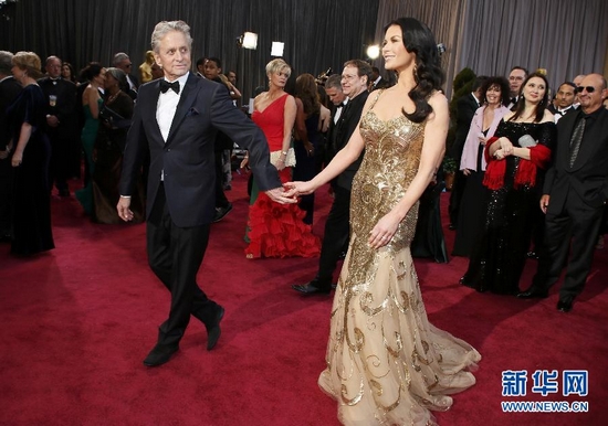 2月24日,在美國好萊塢舉行的第85屆奧斯卡獎頒獎典禮開始前, 影星邁克爾·道格拉斯(中)與妻子凱瑟琳·澤塔·瓊斯(右)亮相紅地毯。當天,第85屆在好萊塢舉行。
